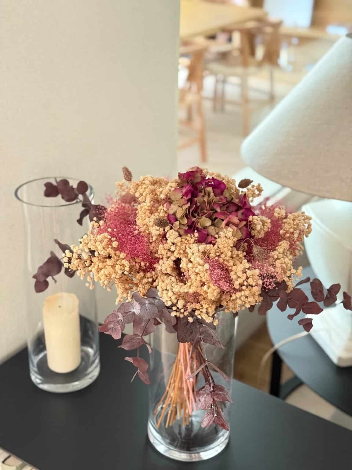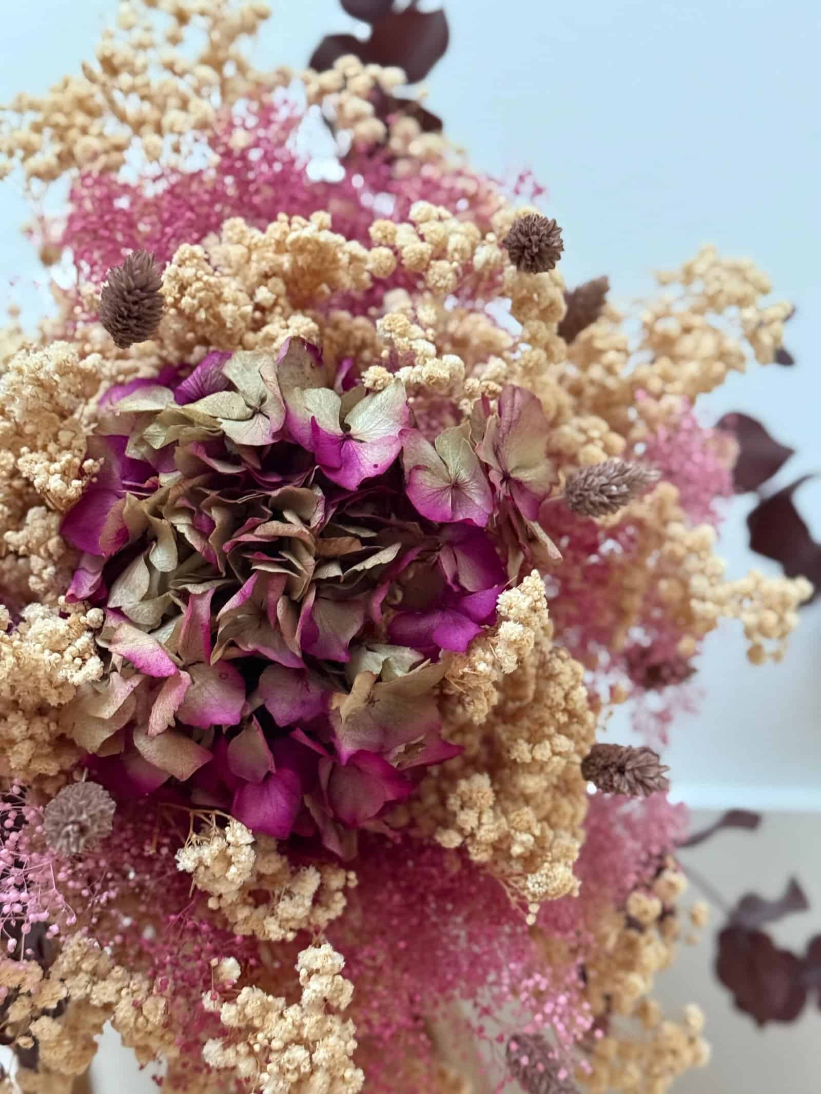 Nuestro ramo hortensia de flores secas y preservadas es una pieza única y elegante que combina texturas y colores naturales. Compuesto por hortensia preservada en tonos burdeos, paniculata, gypsophila mini en dos tonos, phalaris y eucaliptus.